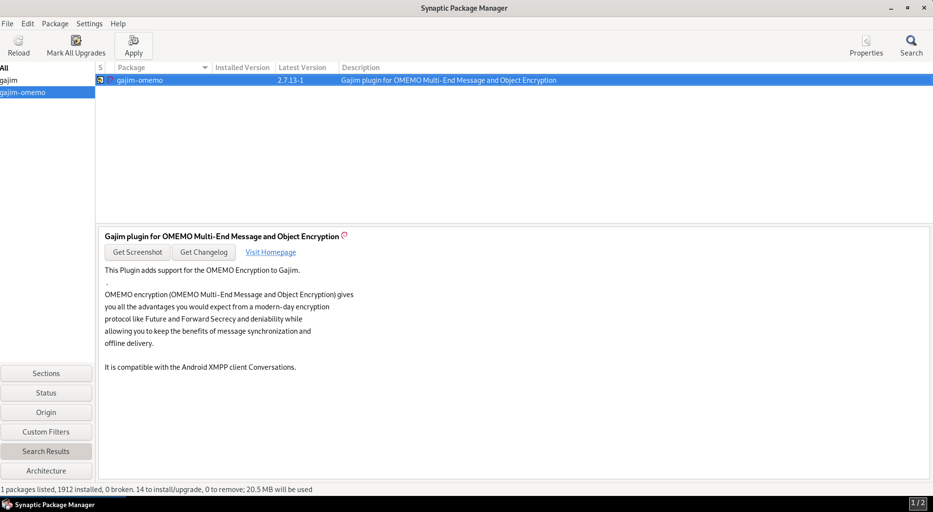 Once package manger is open, click the search on the right, and search for gajim-omemo
