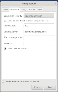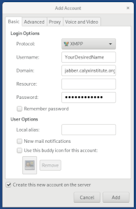 - Domain: jabber.calyxinstitute.org (or whatever jabber server you want to use, see the linked list above)