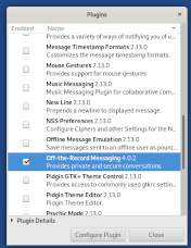 On the one called “Buddy List” go Tools -> Plugins and scroll down the alphabetically sorted list till you see an entry called “Off-the-Record Messaging”. Make sure the checkbox on the left of it is checked, then select the entry and click on “Configure Plugin”.