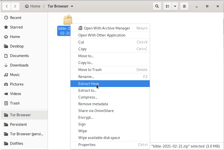 Once the download has finished, Right click and select extract here. If you are reading this on tails, like you should be you will want to make sure you extract the folder into your Persistent folder.
